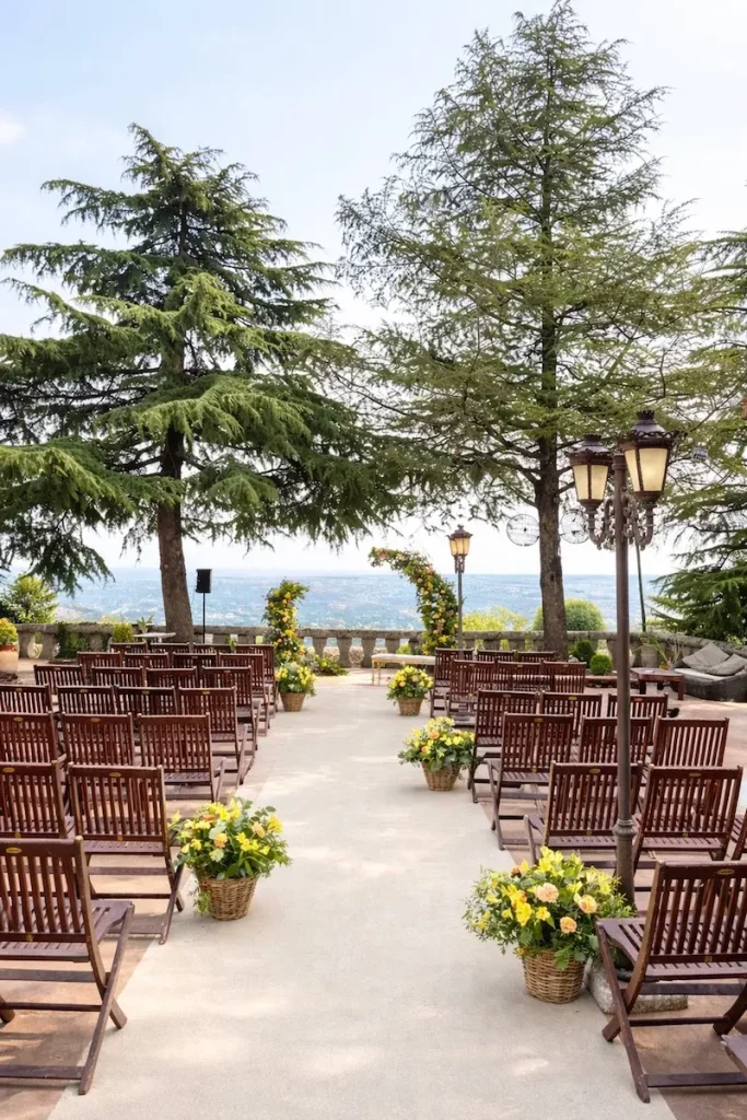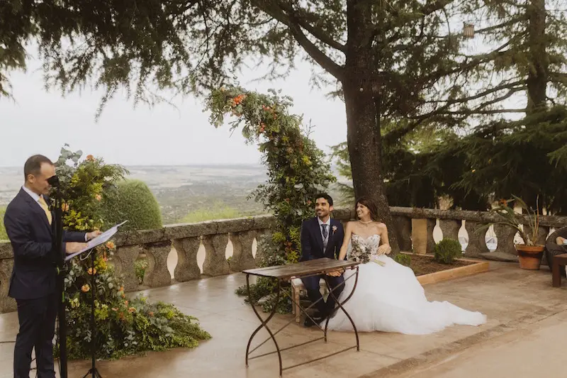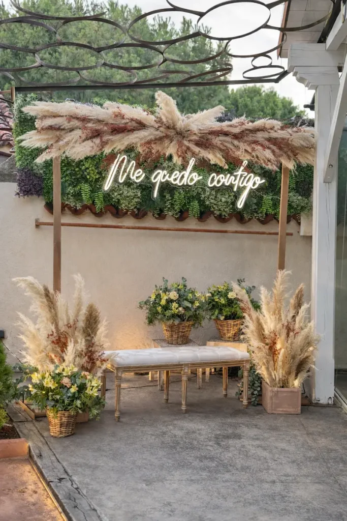 Cuando abordamos la decoración de una boda al aire libre en Madrid, uno de los factores clave es la armonía entre arquitectura, paisaje y elementos decorativos. En este caso, el enclave —con vistas abiertas y vegetación consolidada— pedía una propuesta orgánica, elegante y luminosa. Diseñamos una ceremonia basada en composiciones vegetales naturales con presencia floral en tonos suaves, apostando por materiales que aportaran textura y calidez sin competir con el entorno.
