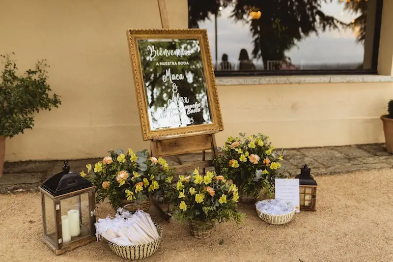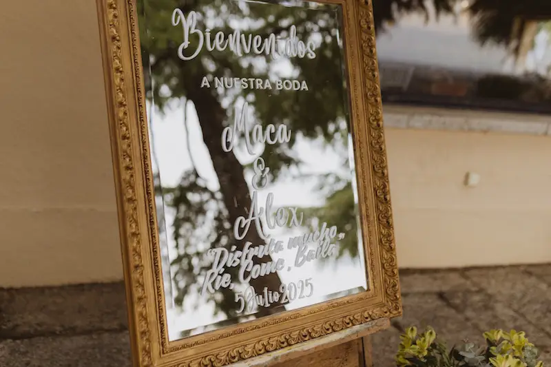 Más allá de la ceremonia, cuidamos especialmente la experiencia del invitado desde su llegada. Para ello diseñamos el rincón de bienvenida con espejo personalizado en vinilo, acompañado de faroles decorativos y composiciones florales coordinadas. Este espacio cumple una doble función: introduce la estética del evento y genera un punto de interacción visual y emocional desde el primer momento. La personalización mediante texto permite reforzar la identidad de la pareja dentro del conjunto decorativo.