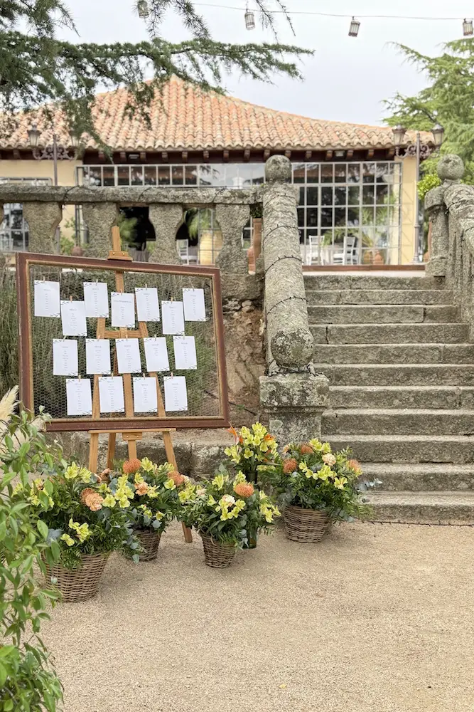 Siguiendo esta misma línea conceptual, el seating plan se planteó como una extensión del lenguaje visual del resto del montaje. Siempre defendemos que cada elemento debe dialogar con el conjunto, evitando piezas aisladas sin relación estética. Por ello se integró con materiales, flores y cromática coherentes, contribuyendo a la sensación de unidad visual en toda la ambientación del evento.