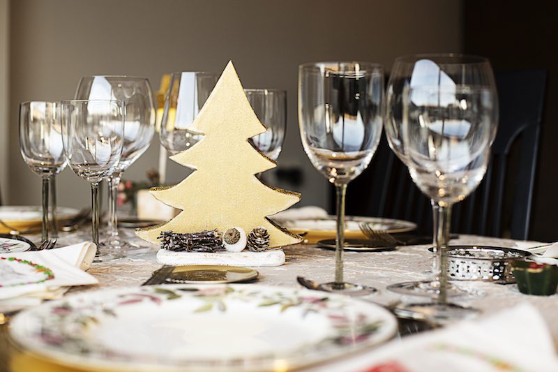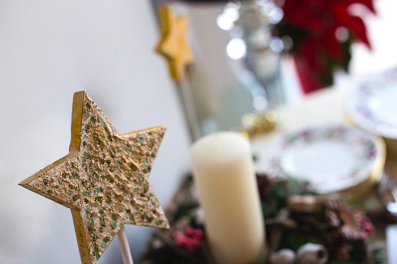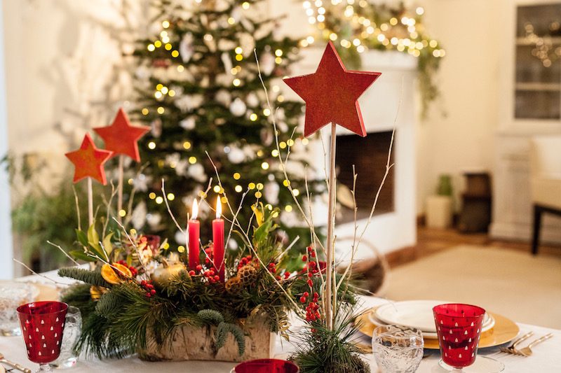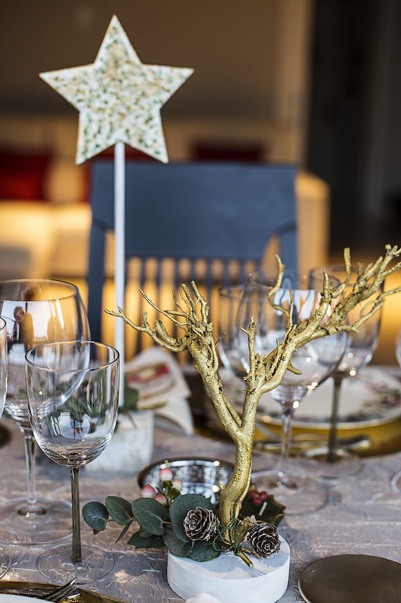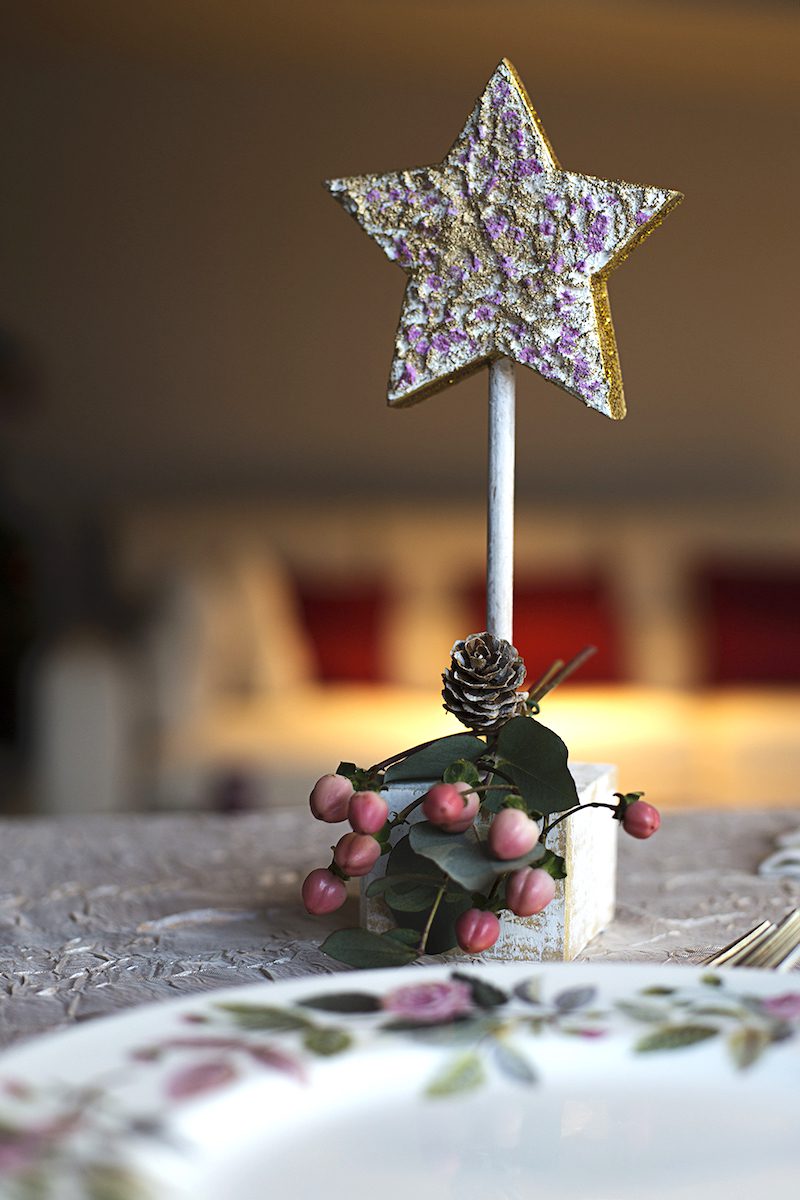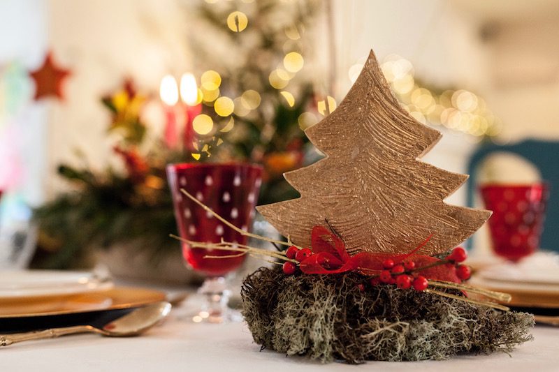 Proponemos mesas decoradas a base de árboles y estrellas de madera en los colores que más vayan con tu decoración junto a un centro de mesa natural.