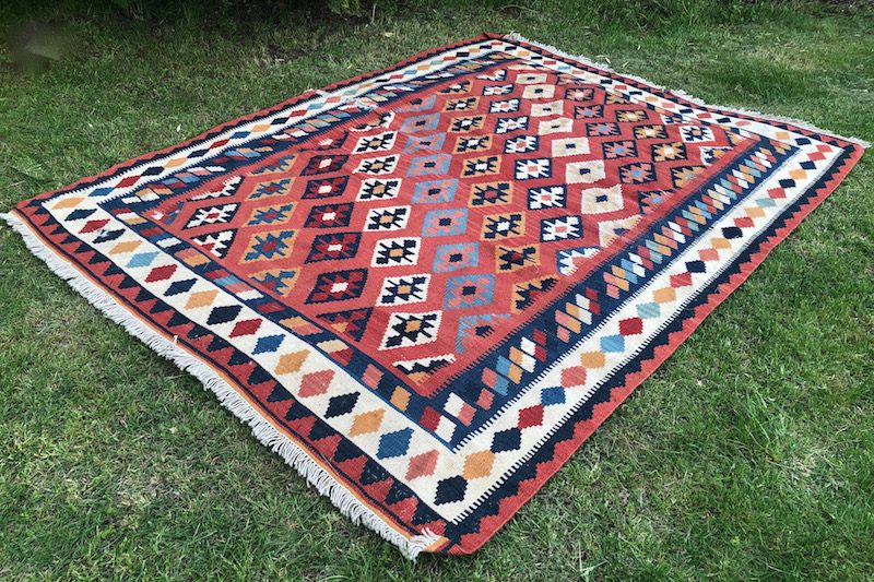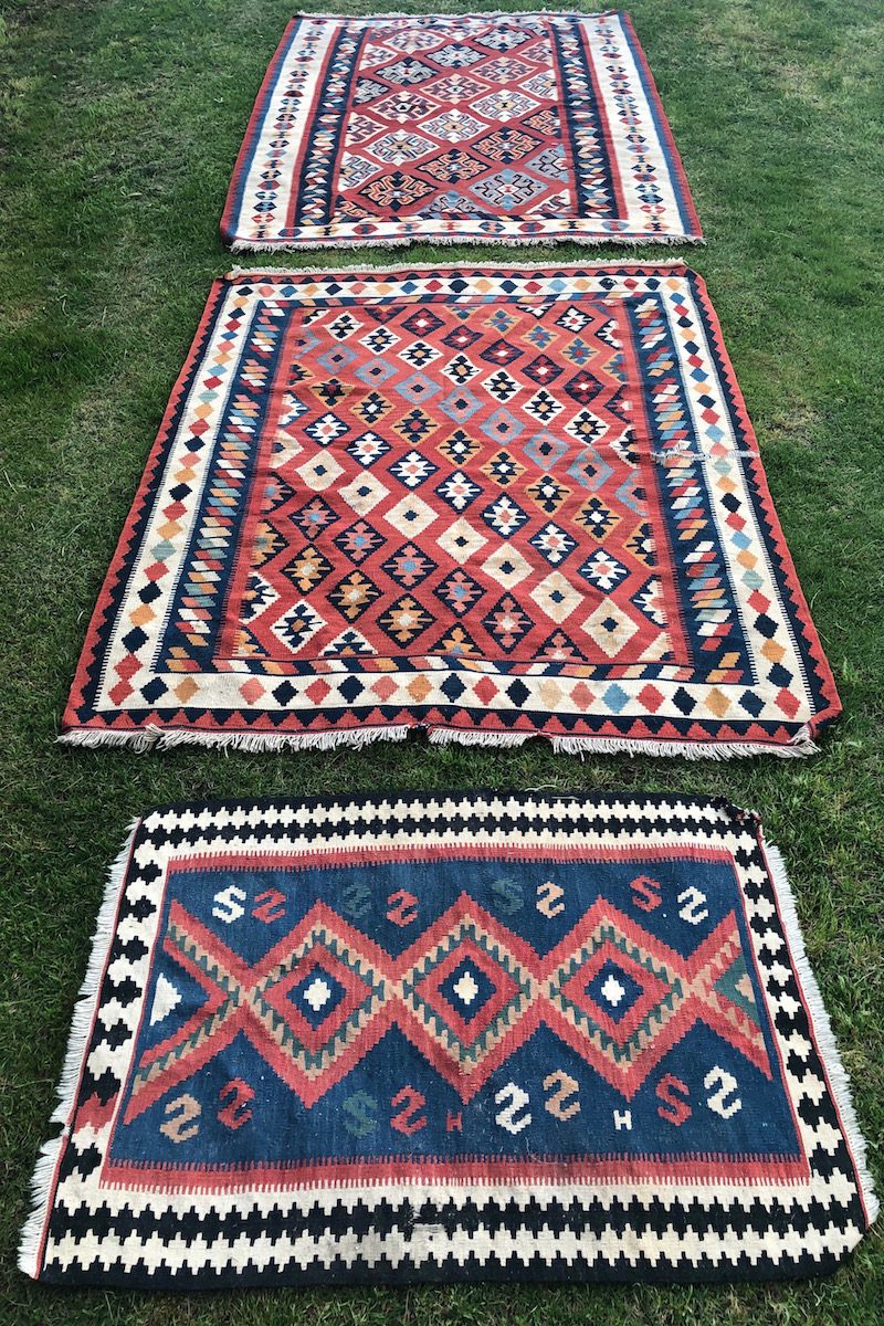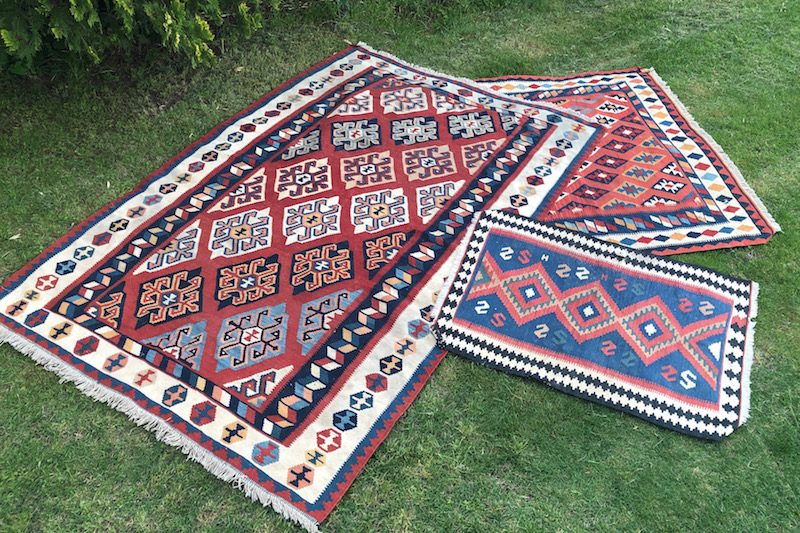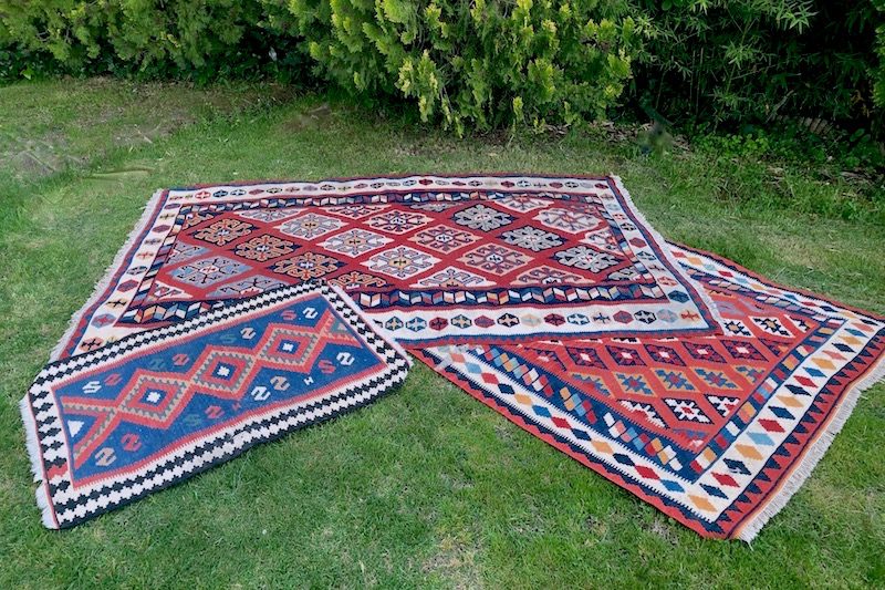 Alfombras kilim de tonalidades cálidas, granates, rojos, anaranjados… de diferentes estampados pero que juntas forman un conjunto perfecto.