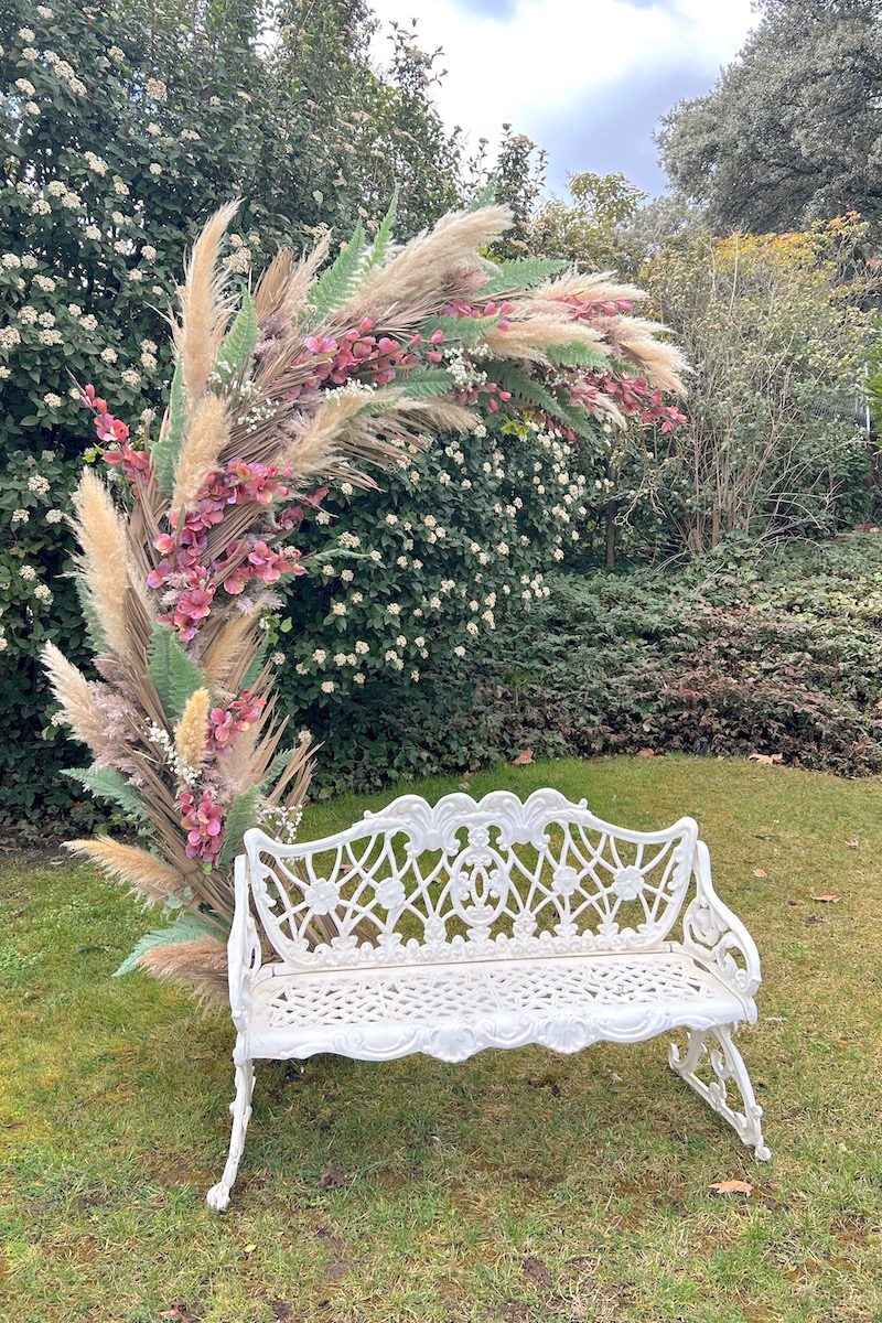Bajo la media luna decorada con flores en nuestro taller puede ser un photocall si tu evento se celebra en primavera.