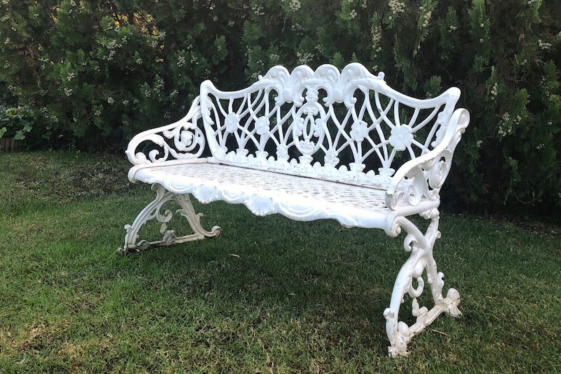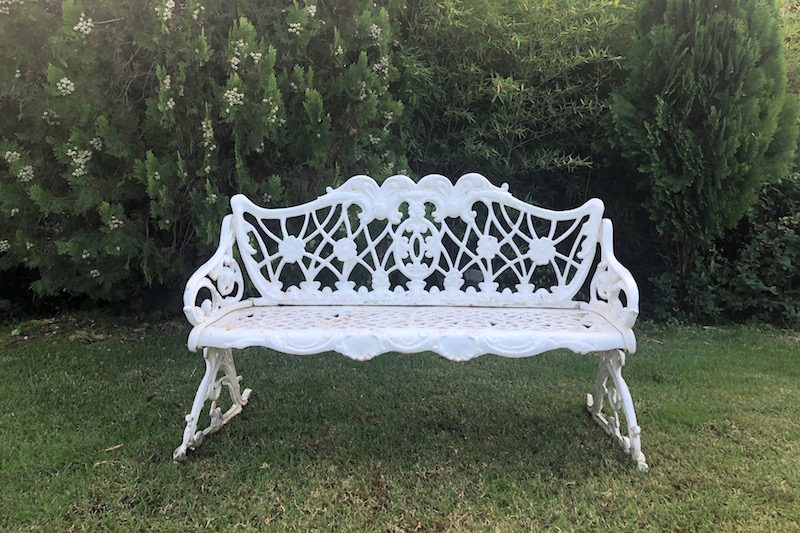 Banco de jardín doble hierro fundido blanco vintage. Ideal para situar en un rincón del jardín en tu boda o evento.