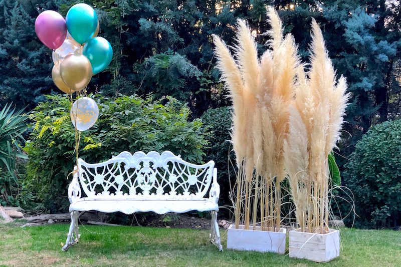 Los globos resultan un elemento divertido en Comuniones. Este banco junto a un grupo de pampas y un pomo de globos crea una atmósfera de cuento.