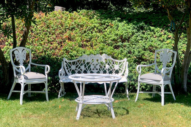 Mostramos algunos ejemplos de nuestro banco de jardín acompañado por otros elementos.