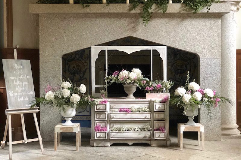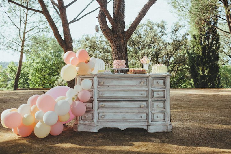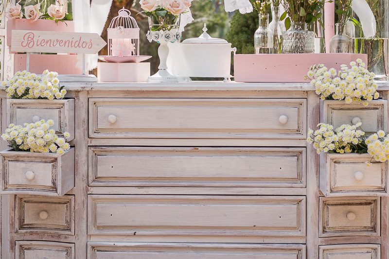 Crea una bonita decoración con esta cómoda vintage. Desde decorada con flores en un rincón de bienvenida en una boda hasta con globos para componer un dulce candy bar.