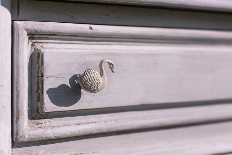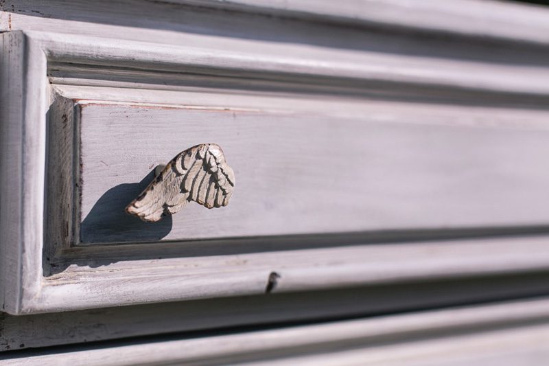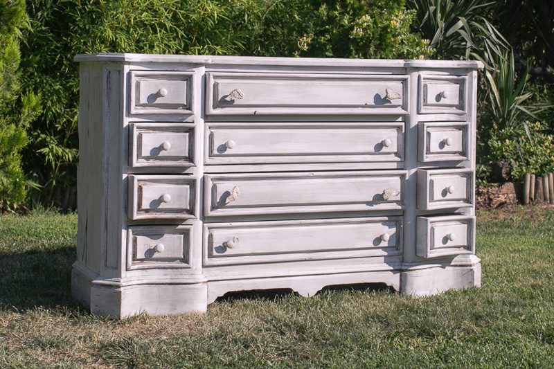 Restaurada y pintada en blanco tiza, tienen detalles que le dan personalidad como los pomos que son diferentes.