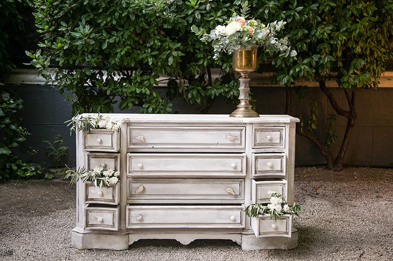 Cómoda vintage de múltiples usos en decoración. Crea con ella un bodegón impactante en tu evento.