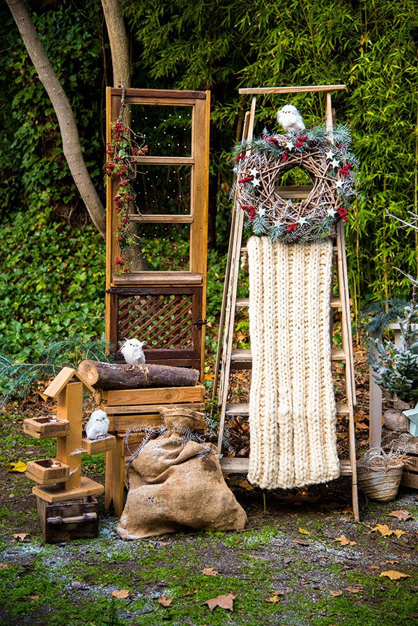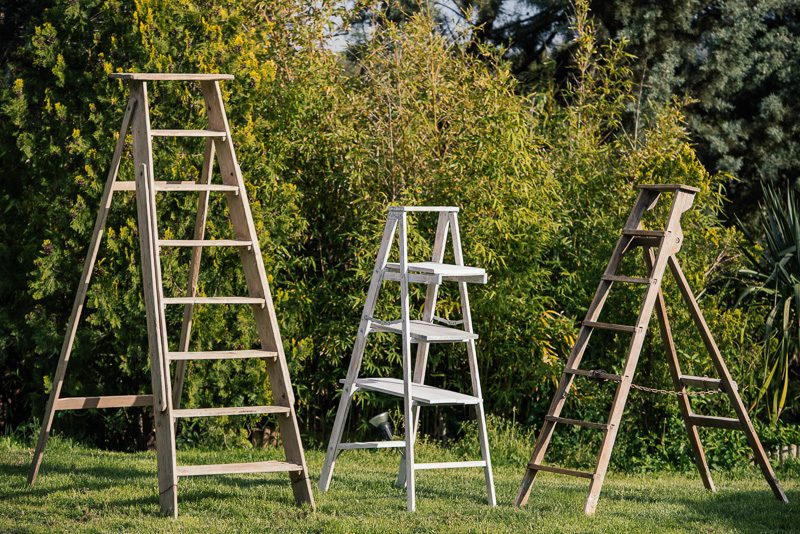 Escaleras vintage de madera restauradas con múltiples utilidades. Perfectas para decorar eventos con guirnaldas, macetas… Un buen soporte para colocar detalles en tu evento.