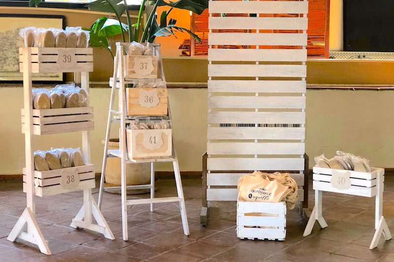Una escalera es un soporte original para presentar colocadas las alpargatas de las invitadas en una boda.
