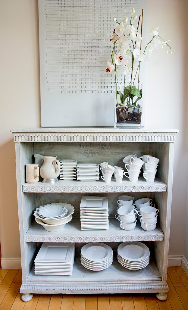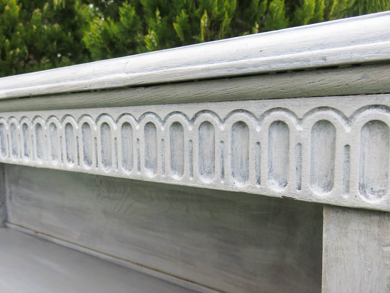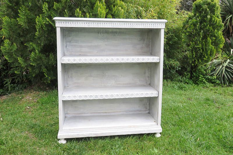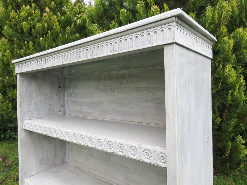 Estantería decapada en blanco de 3 estantes con molduras originales.  Util para colocar en tu evento lo que necesites: folletos, regalos, detalles…