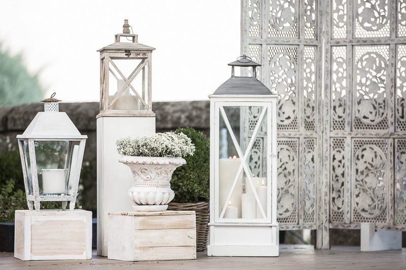 • Faroles blancos: Para componer decoraciones de estilo vintage  y hacer bodegones como el que se muestra.