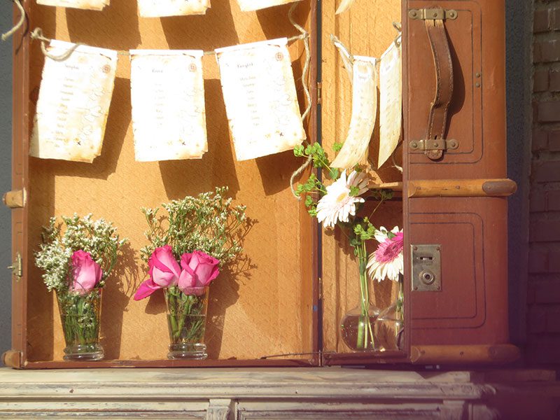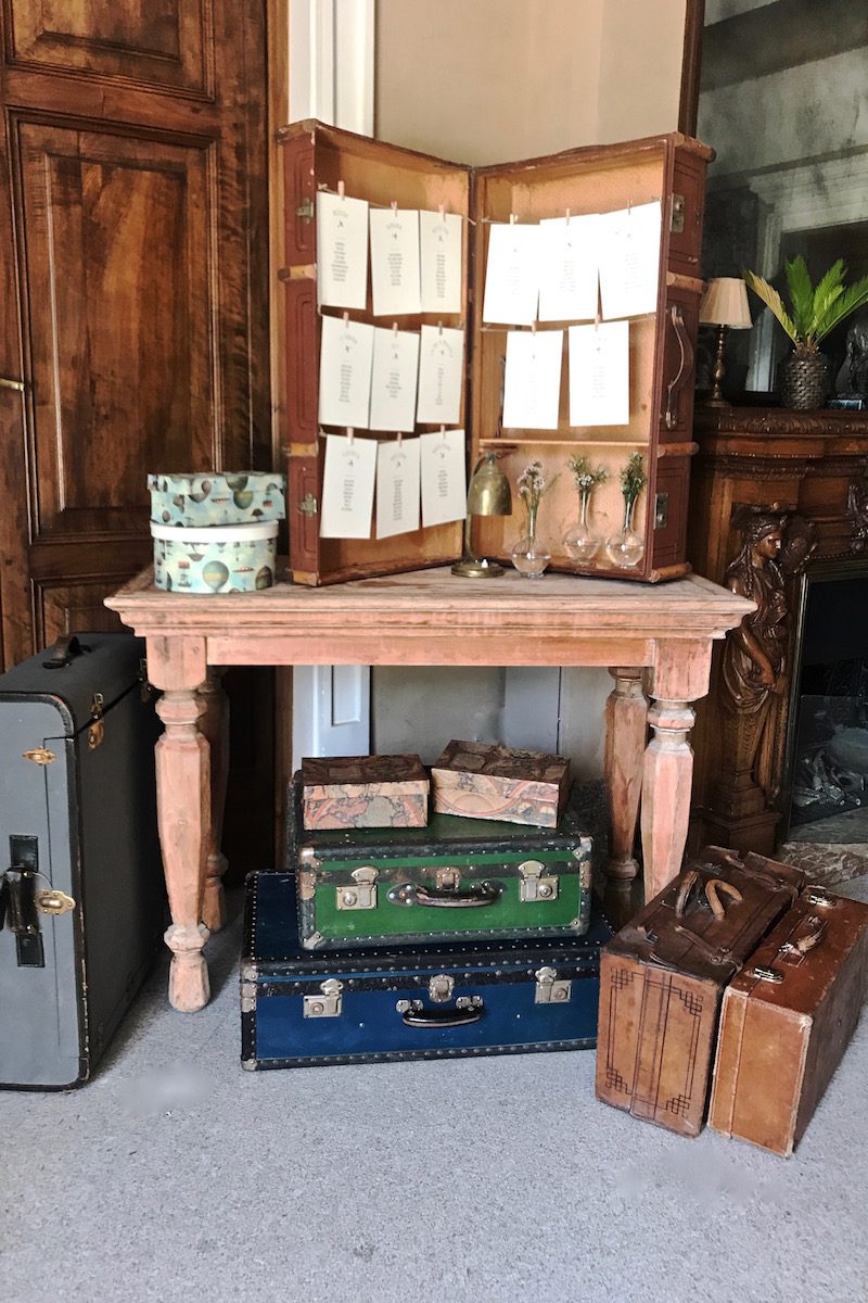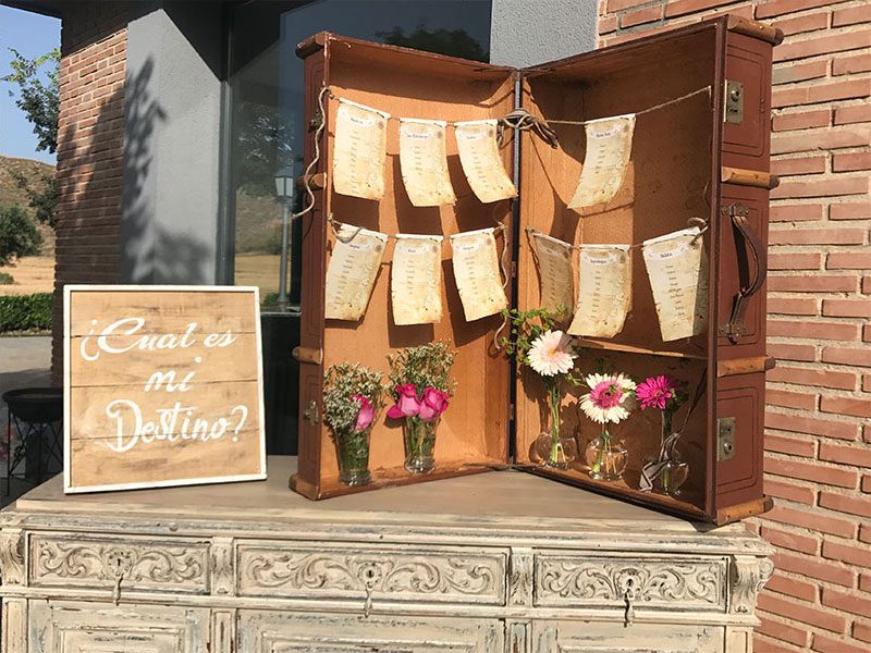 En boda de temática viajera estas maletas se alquilan para colocar el seatingplan con la relación de comensales que se sientan en cada una de las mesas.