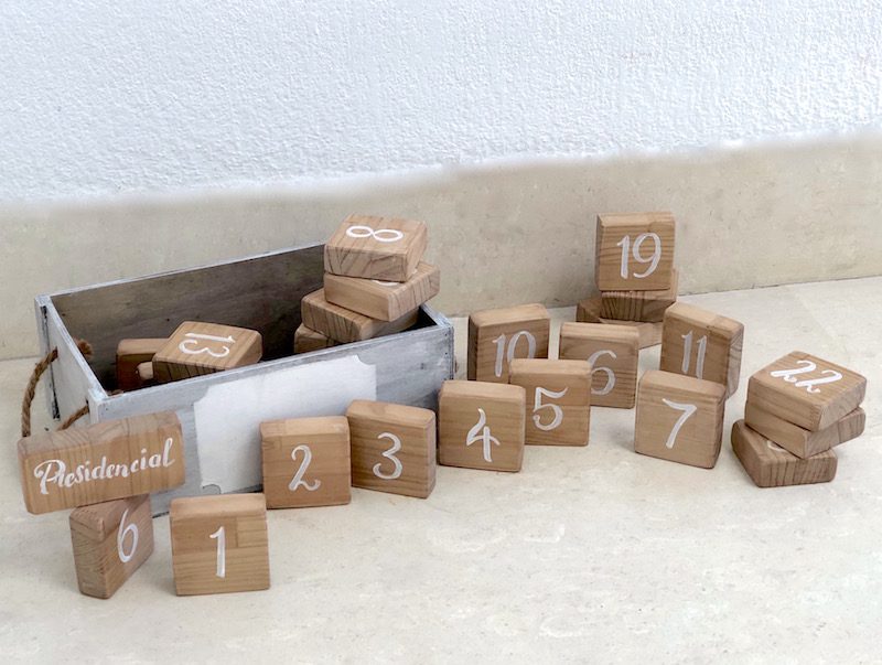 Elaboramos meseros personalizados en madera para decorar mesas en bodas y eventos con pie para que puedan quedarse apoyados por si solos.