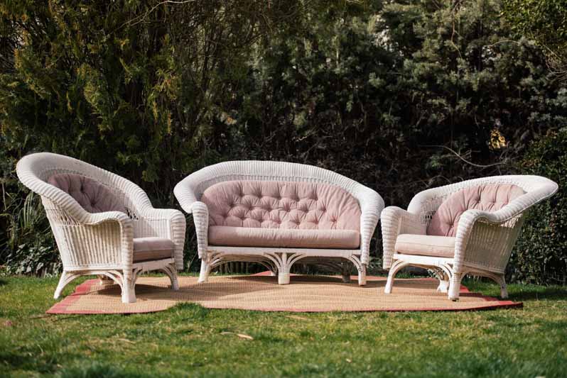 Tresillo chill out de médula tapizado en capitoné. Aporta un rincón de descanso acogedor en tu evento si se celebra al aire libre.