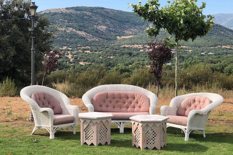 Los invitados en toda celebración agradecen poder relajarse en rincones agradables. Tresillo chill out cómodo y elegante.